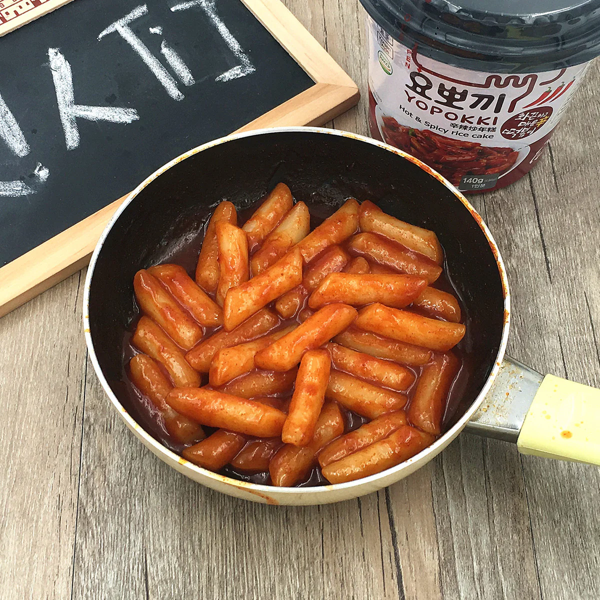 Sau khi bỏ bánh gạo topokki vào trong chảo, bỏ gói sốt và 100ml nước vào. Khi bắt đầu sôi điều chỉnh lửa đun tầm 5 phút.