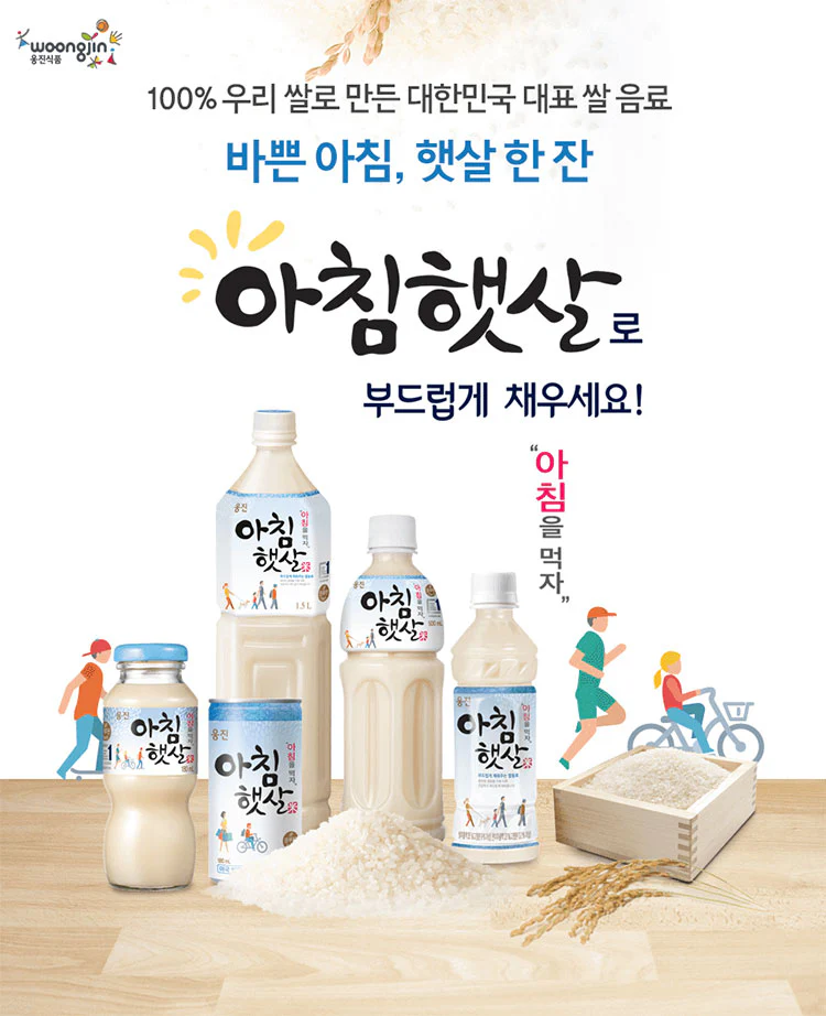 Nước gạo rang là thức uổng bổ dưỡng được chiết xuất từ lúa trồng tự nhiên, Morning Rice (nước gạo buổi sáng) là thương hiệu nổi tiếng của Woongjin. Đây là loại thức uống từ gạo đầu tiên trên thế giới được tung ra vào năm 1999, chứa nhiều hương vị độc đáo và giá trị dinh dưỡng khi được làm từ 100% ngũ cốc trong nước bao gồm gạo và gạo lứt.
